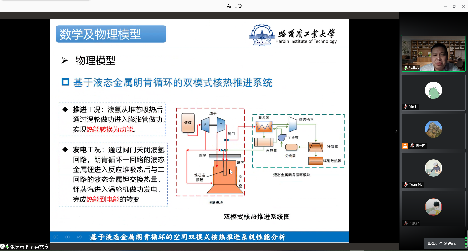 随后,张昊春教授基于空间核能利用这一背景,向我们讲解了千瓦级空间核动力热离子转换系统、火星大功率星表基地钠冷快堆超临界二氧化碳布雷顿循环系统、基于液态金属朗肯循环的空间双模式核热推进系统以及基于超临界二氧化碳布雷顿循环的双模式核热推进系统的系统组成、工作原理和系统优势等,并对系统集成、转换特性、结构选型、部件设计、空间工况等关键因素对系列化、多型谱、多模式、一体化、兆瓦级功率的空间核电源及核热/核电推进系统的热系电转换特性及优化设计的影响进行了讨论。