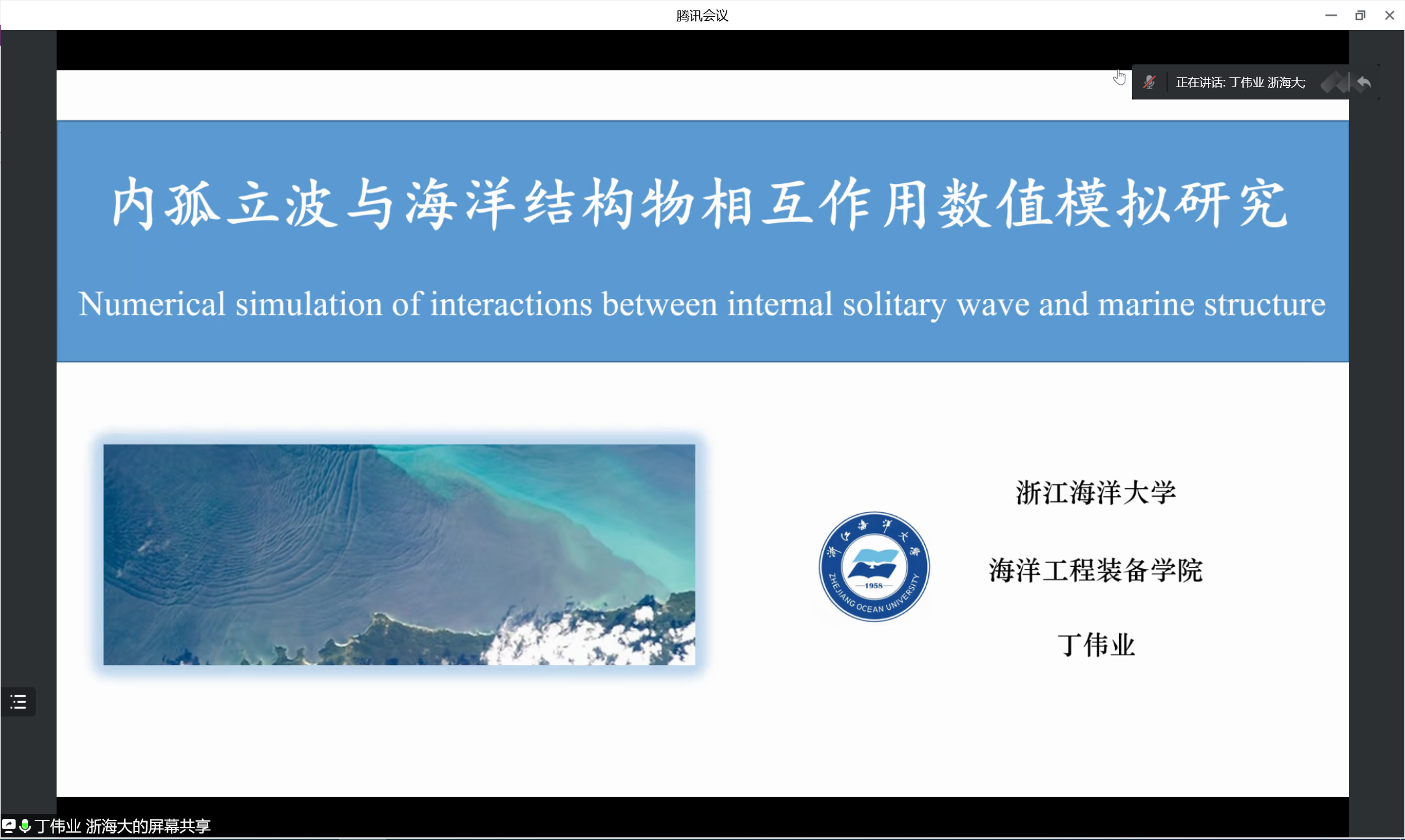 杜鹏副教授的邀请,在线上为师生作“航海大讲堂”系列讲座(二十二)——《内孤立波与海洋结构物相互作用数值模拟研究》学术报告。会议由杜鹏副教授主持,新加坡国立大学、浙江海洋大学、本校动漫屋