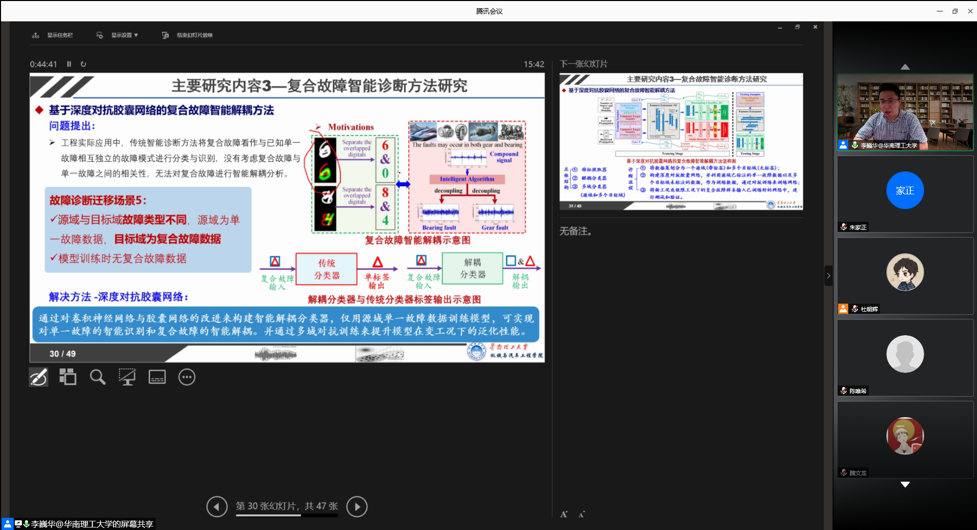 师生生动地介绍了如何进行深度迁移学习,然后介绍了深度迁移对抗学习的思想和策略,并从装备变工况下智能诊断模型泛化性能、新故障自动识别方法、复合故障智能诊断技术以及多源传感信息融合方法等具体方向深刻阐释了深度迁移学习这项技术及其应用。
