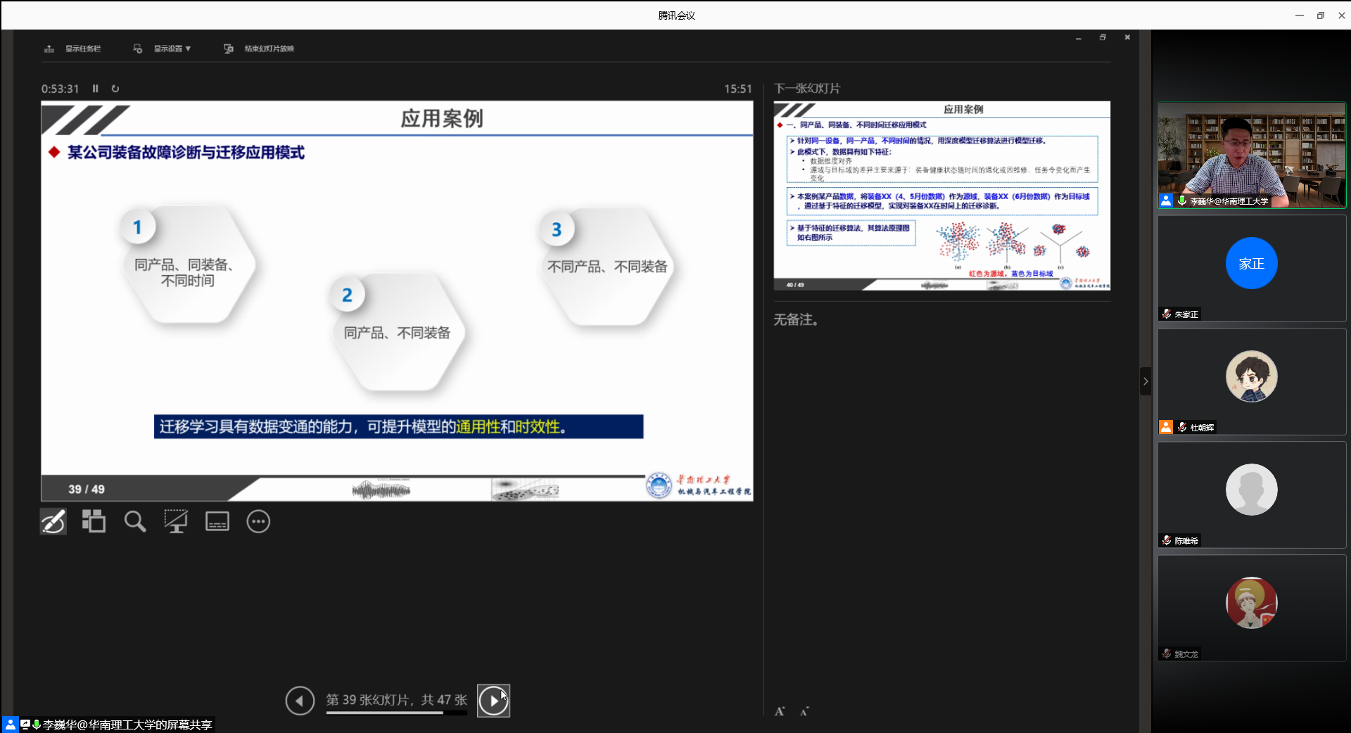 最后,在讲述了深度迁移对抗模型和技术成果后,以华为公司委托的智能诊断项目为例,深入地分析了如何把迁移学习理论模型应用于工程问题的解决,展示了人工智能技术的显著工程价值,让与会师生获益匪浅。