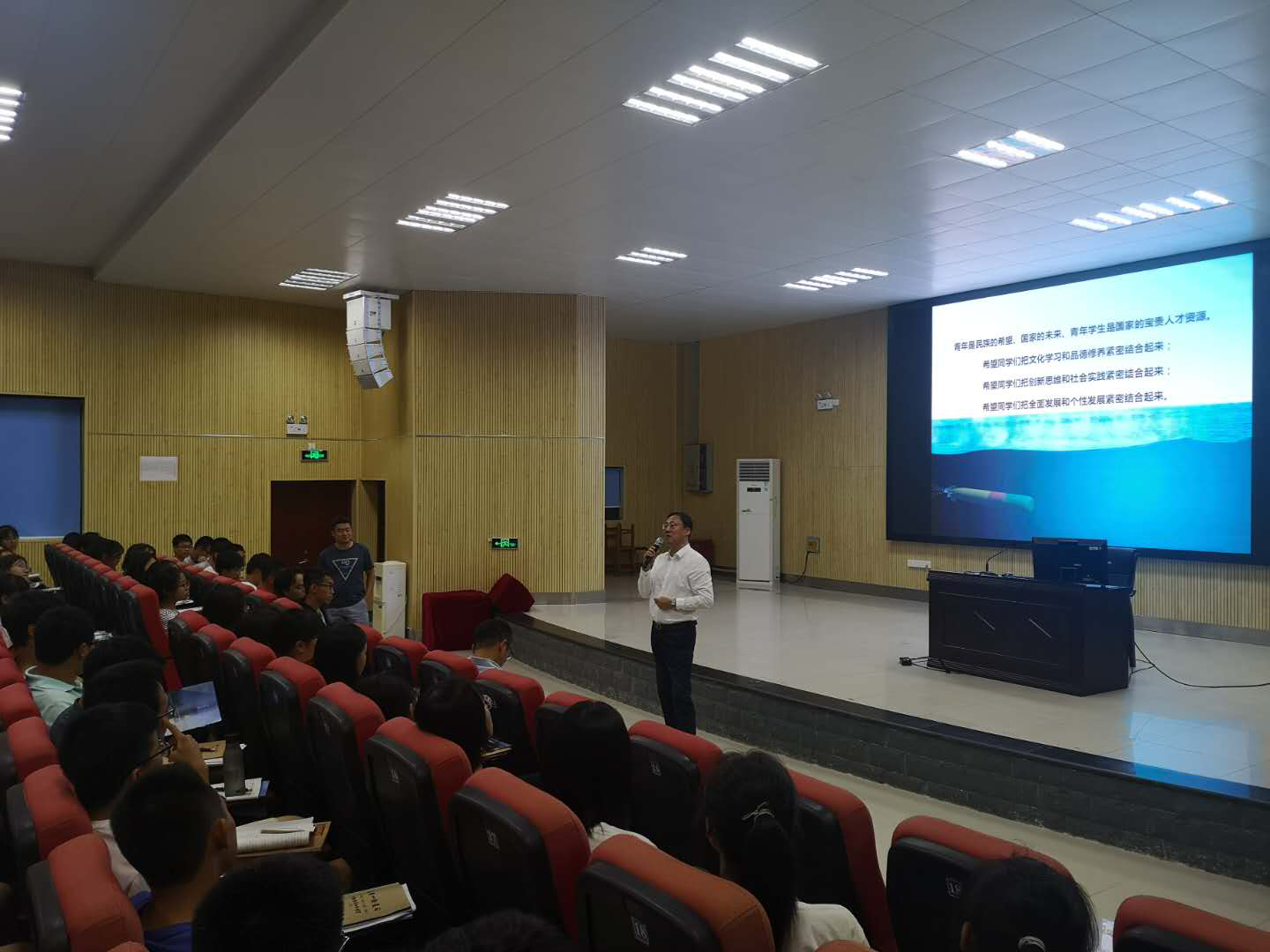 10日晚上,潘光教授在柳州中学(柳南校区)做了题为《蓝色海洋——奇妙的水下世界》的科普报告,300余名高三学生聆听了精彩的报告,潘光教授从西工大现象、家国情怀、学科前沿、人生理想等方面展开讲座,并以自己的求学、科研经历,引导激励中学生们树立远大理想,献身国防事业,现场掌声不断,反响强烈。讲座完毕后,孙华强老师代表学校向柳州中学赠送了由民用无人机研究中心赞助的纪念品。
