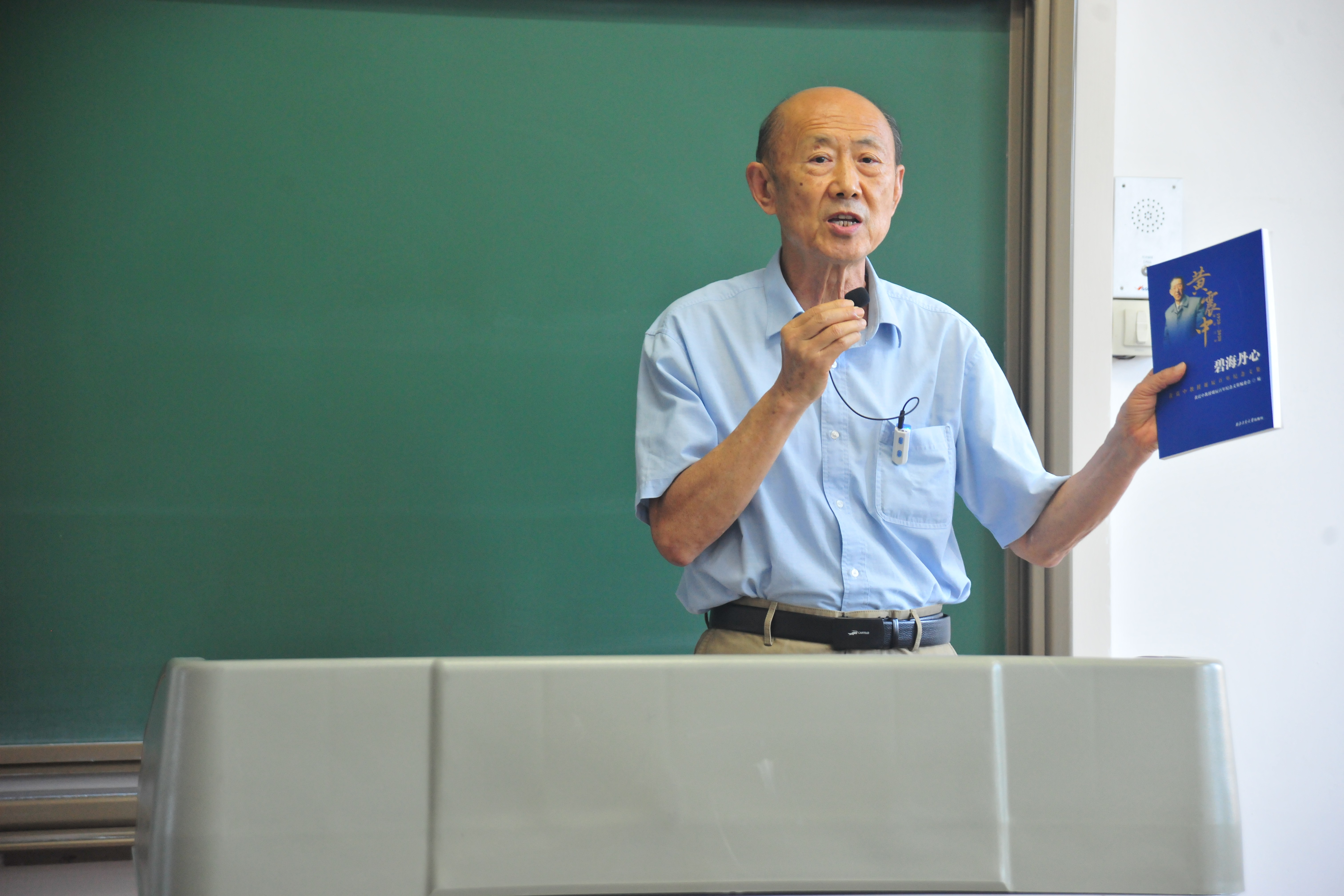 前院长黄建国教授讲话。面对着年轻的面庞,黄建国说到,大学求学是人生中非常宝贵的学习机会,是人生历程中特殊且闪光的特殊经历。并介绍了《碧海丹心——黄震中教授诞辰百年纪念文集》,书中讲述了动漫屋