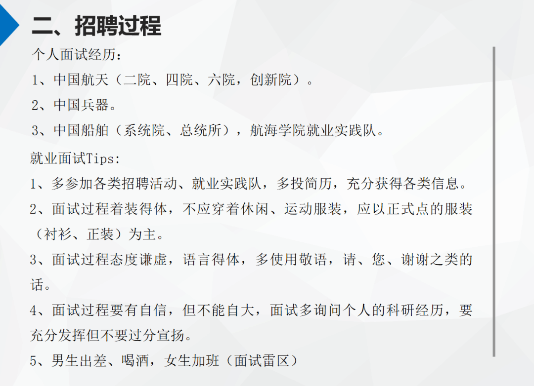 的不同专业,签到了国企、研究所、私企,非常具有代表性。此次就业经验交流分享会上,研三师兄师姐们分享的求职经历生动、有趣、接地气,用温和的语气,诚恳的态度,流畅的语言将他们的求职经历一一讲述给我们听,展现出他们踏实认真和积极进取的人生态度。