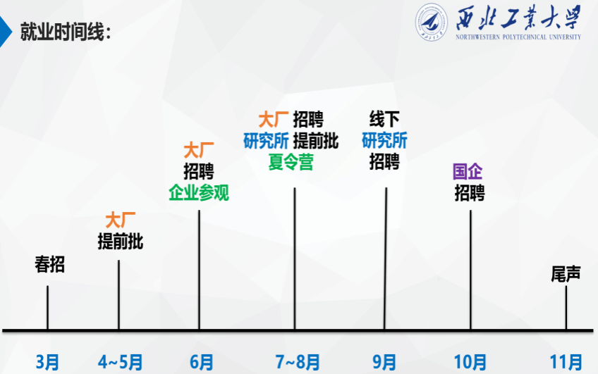 高晓华指出要提早为就业做好准备,每年的秋招战线虽然很长,但是提早的准备更容易拿到心仪的OFFER。她用一张图生动地为大家展示了就业时间线,分享了大厂的笔试面试经验。