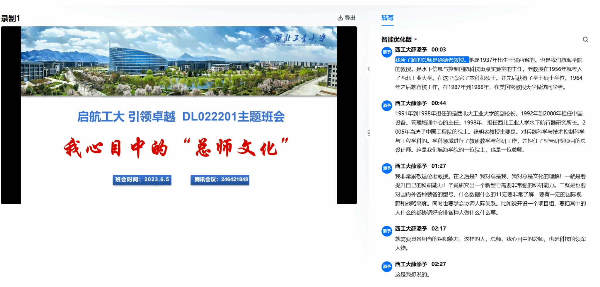 首先是班长薛添予进行分享,他主要说了徐德民院士的事迹以及自己对总师文化的感悟,认为总师需要三个优点:过硬的科研能力、广阔的国际视野、较强的协调能力。