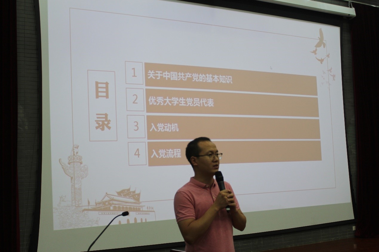 本科生F1辅导员任树伟首先进行了大学生入党宣介,介绍了党的基本知识和入党流程等相关信息。任老师系统全面地讲解了大学生入党的相关注意事项,介绍了学院优秀大学生党员代表,充分调动了同学们的入党积极性,并让广大新生同学明白了具体如何积极向党组织靠拢。