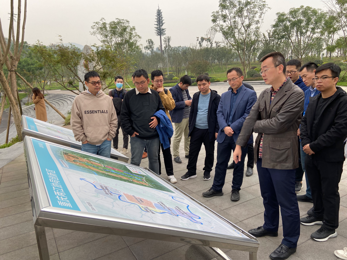 重庆科创中心副主任齐天的带领下来到了位于重庆两江新区的两江协同创新区,第一站首先前往创新区中心的明月湖参观,在现场听取了对于两江协同创新区建设进度的讲解,并实地探访了动漫屋