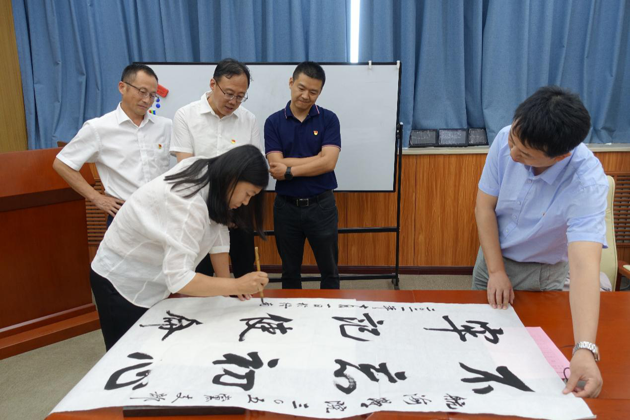 随后艺术教育中心教师、西安交通大学书法博士、青年党员教师、陕西省青年书法家协会秘书长白慧现场挥毫,书写下“不忘初心、牢记使命”,赠送于305党支部。