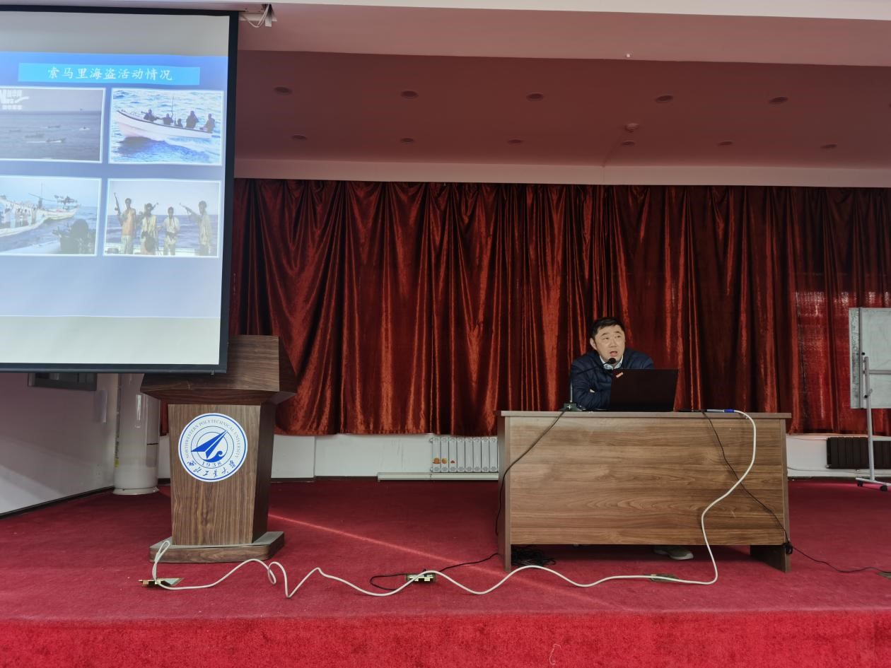 张岩老师,以自己服役期间特殊的亚丁湾护航经历给同学们上了一节生动的党课,为同学们解读建设海洋强国的必要性和重要性。党课由张晓燕老师主持,耿云辉助理参加。