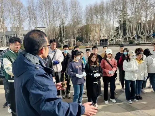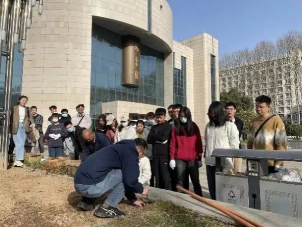 随后,参与的师生们现场两两分组,依次领取韭莲和劳动工具,在相关技术人员的耐心指导下,学习如何划线挖坑、种栽培土。同学们热情澎湃,积极投入于种植过程中,现场热火朝天,一派繁忙景象。