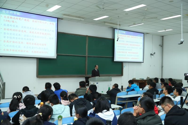 课程伊始,马院士以视频短片、科教短片的形式介绍了海洋大环境的特点。海洋环境复杂,影响因子多,海洋占地球表面积的71%,占地球保有水量的97%,地球上绝大部分水在海洋中翻滚,地球上有一半的氧气产生于海洋,地球的火上活动90%发生在海洋,40%的人口生活在离岸90公里的区域内,海洋的平均深度是3650米,全球最长的山脉几乎全部存在在海洋之中等等,海洋是如此多样化,如此丰富,海洋未勘探的面积达95%,值得也需要我们去积极探索。除此之外,马院士还以可以长到一层楼高的海带生动的例子引入,讲述海洋生物的多样性、丰富性。海洋还是气候的稳定器,其对于地球环境的保持具有举足轻重的作用,马院士强调,保护海洋环境是每个人义不容辞的责任。