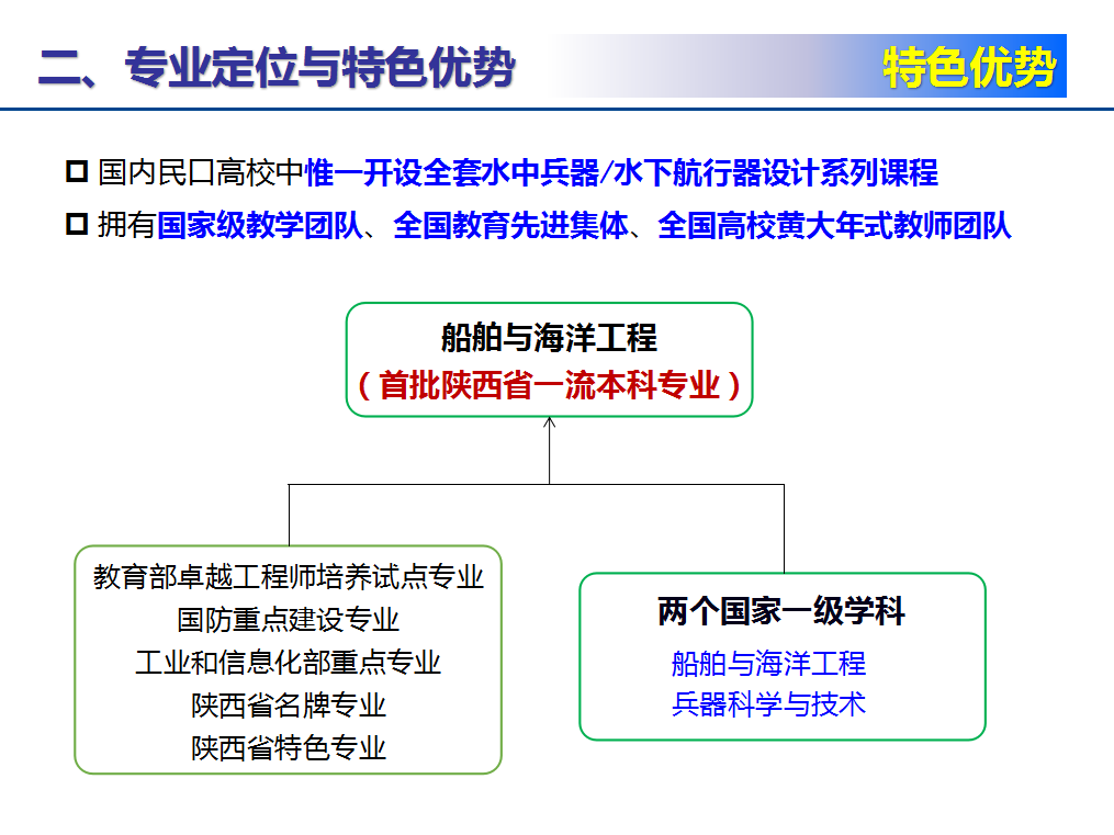 船舶与海洋工程专业是首批陕西省一流本科专业,拥有国家级教学团队、全国教育先进集体、全国高校黄大年式教师团队,教学实力雄厚,拥有特色鲜明的人才培养模式,使用创新教育教学手段,激发学生自主学习动力,以实践育人、科教协同育人,实施全周期工程实践教育,以国际学术交流、交换培养、多元文化交融、联合主办国际会议等多元化英文授课、多形式联合培养,稳步提高国际化水平。