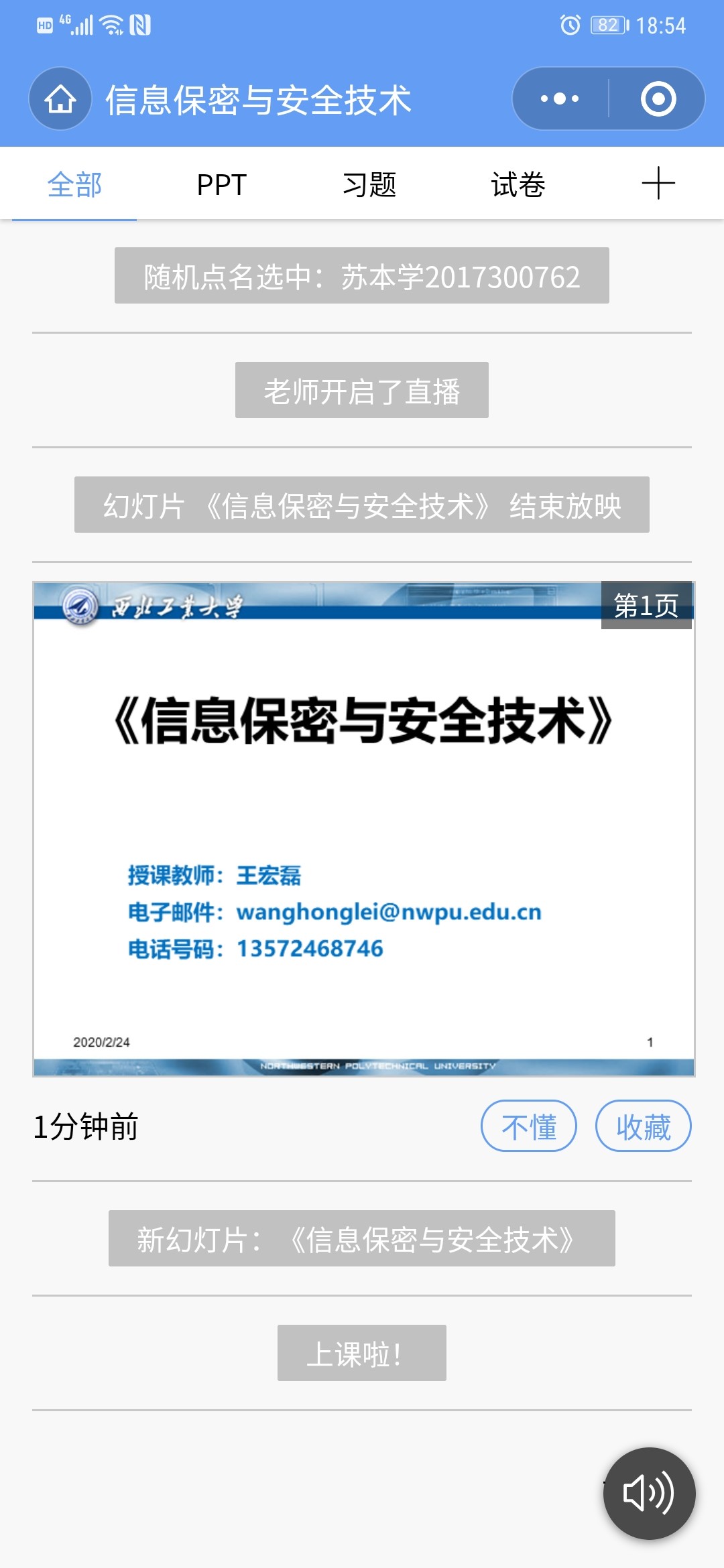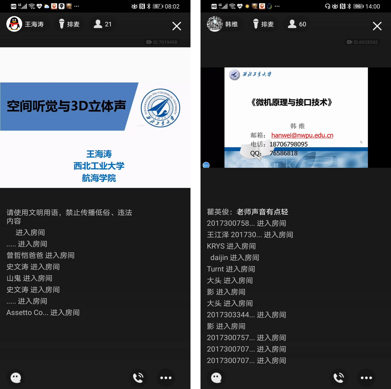 此外,为保障授课质量,学院成立由院长潘光、书记孙华强任组长,院领导班子、本科教学督导专家、各专业负责人和方向课程群负责人、各系教学副主任及有在线授课经验的中青年骨干教师组成的共27人的在线教学质量监督保障工作组,并建立了相应的工作群。在今天的授课过程中,学院在线教学质量监督保障工作组根据专业方向分别加入各门课程旁听数十人次,在关注在线授课形式的同时,也对授课内容和教学效果进行了监督,并在课间休息时将直播过程中出现的问题和存在的不足与授课老师进行了沟通。