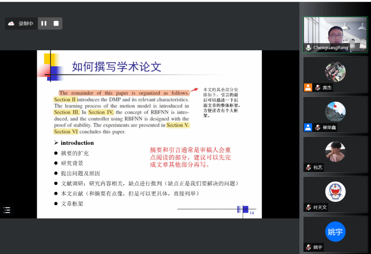 随后,杨老师从梳理文献、如何找到有意义的选题、如何撰写学术论文、参考案例和如何产生新的研究思路五个方面详细介绍了研究生科研入门主要注意事项,并结合自己论文发表过程的实例深入浅出的介绍了撰写科研论文的要点。