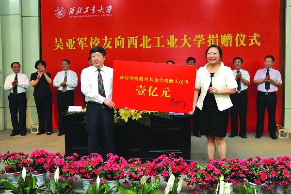校友讲席教授基金”。每次捐赠,吴亚军都坚持不请记者、不做报道,她常说自己是怀着一颗感恩之心在回报母校的。在谈到自己的求学生活时,吴亚军深情地说到:“非常感激母校的培养,感谢师长们的谆谆教诲;西工大是所非常好的学校,在这里,所有的学生都被滋养过。今天,我了解到这么多的校友做出了这么突出的成绩,我非常自豪。所以我感到,回馈母校西工大是最有价值的!”